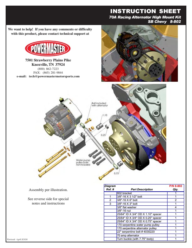 Pro Series Alternator Kit; High Mount Racing; 65 Amp; Incl. Offset Right Alternator PN[8102-1]/Water Pump/Alternator 3 Groove Pulley [170]/Bracket [802]/Gates Belt [4030220];